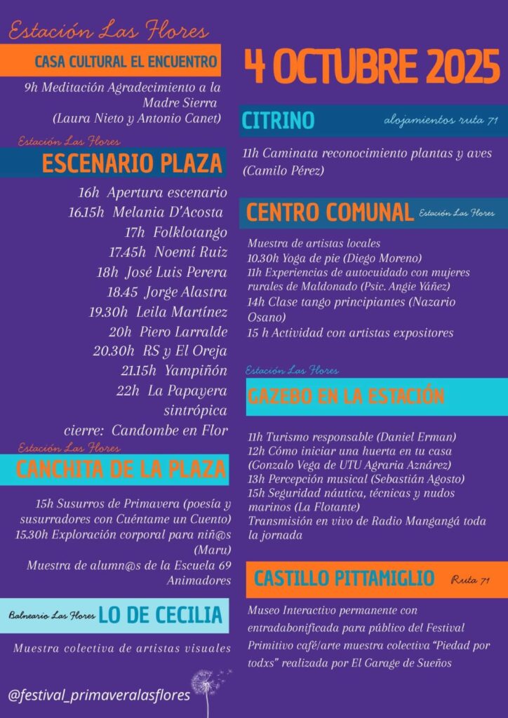 En esta charla con Antonio Canet, uno de los organizadores del Festival de la Primavera de las Flores, conocemos los detalles de este encuentro comunitario que se realizará el sábado 4 de octubre en Estación Las Flores, coincidiendo con el Día del Patrimonio. El festival nació del deseo de juntar a toda la región de Solís Grande en una celebración que incluirá música, danza, feria artesanal, talleres, comida casera, espacios para la niñez y mucho más. Lo más lindo es cómo la comunidad local se está sumando: la escuela y el Baby Fútbol participan activamente, preparando una muestra plástica y un rescate fotográfico e histórico del pueblo.